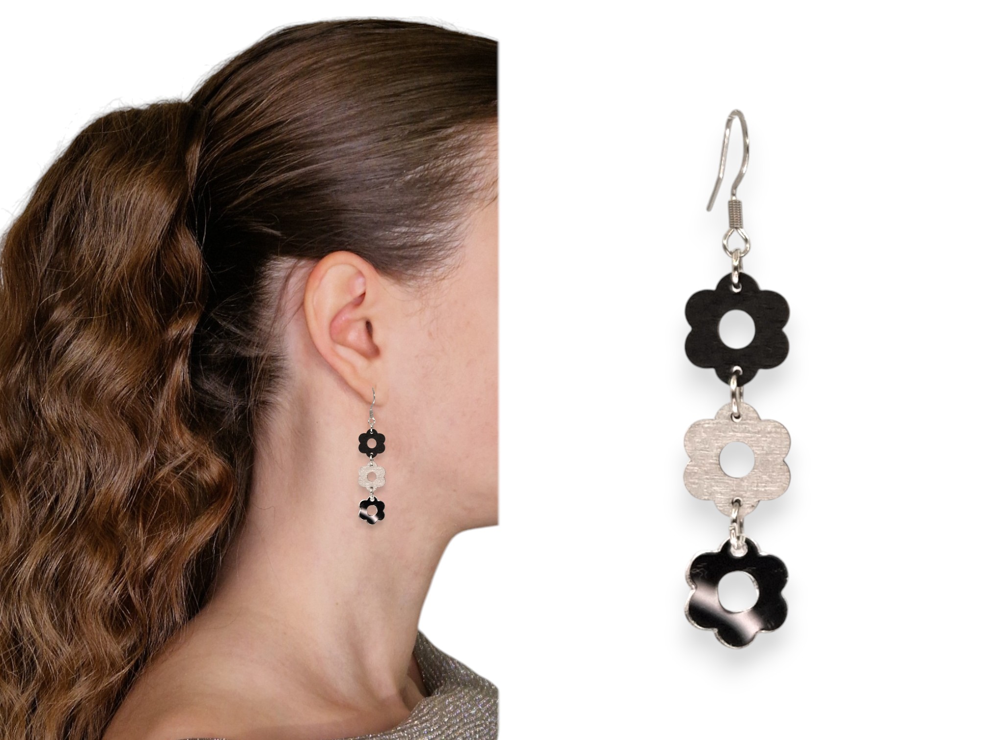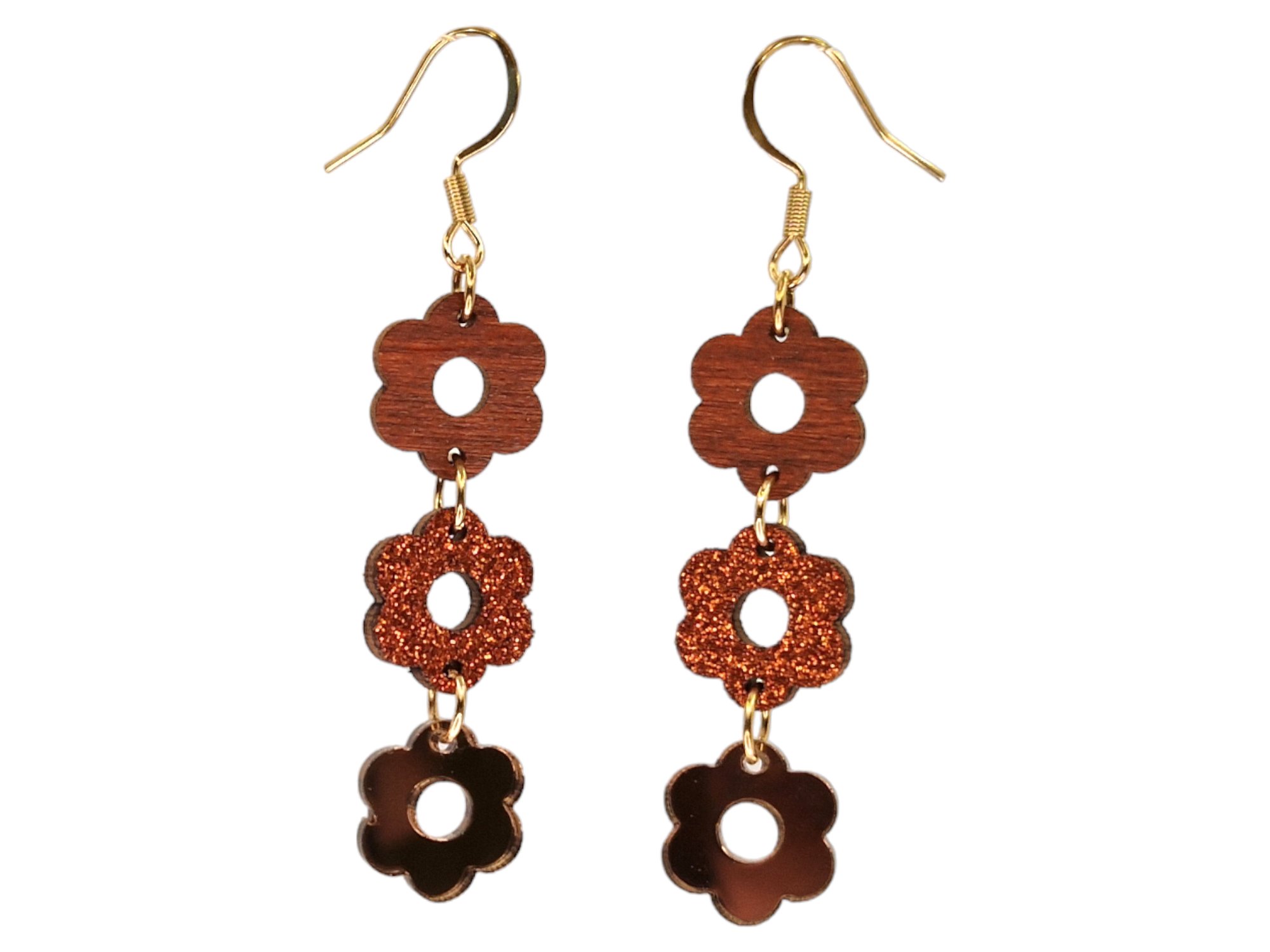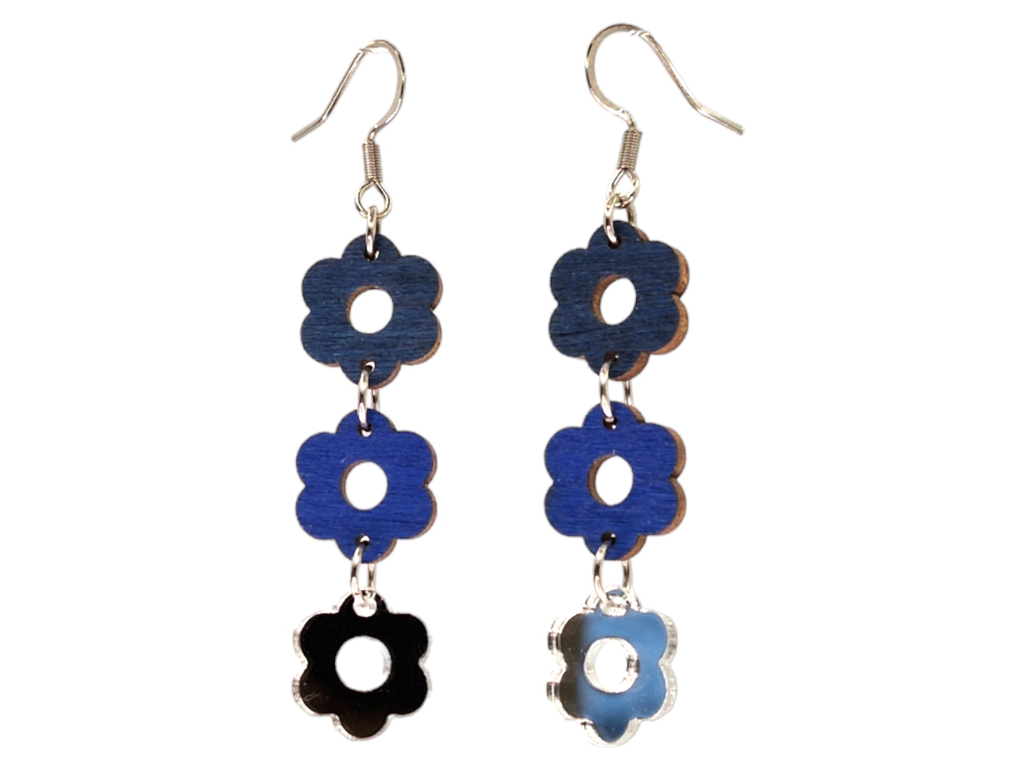 Viola korvakorujen kolmesta roikkuvasta kukasta yksi on peiliakryylia ja kaksi on puuviilua.  puuosaa. Valitse itse koruihin sopiva väriyhdistelmä, yli 60 värivaihtoehtoa.