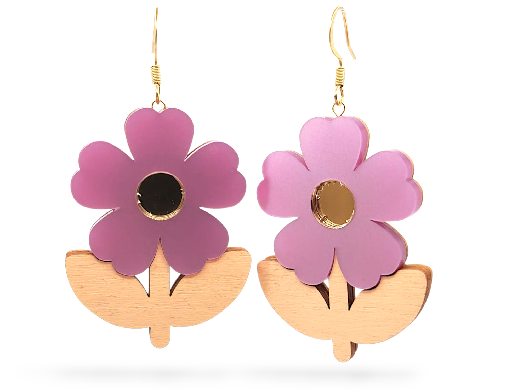 Materiaali: Puu ja akryyli, koukku kirurginterästä, koukku joko teräksen värinen tai kullattu, korujen metalliosat korkealaatuista ruostumatonta kirurginterästä. Korujen tausta osa on vaalean ruskea. Koukkujen mukana toimitetaan silikonitulpat.
