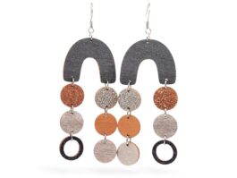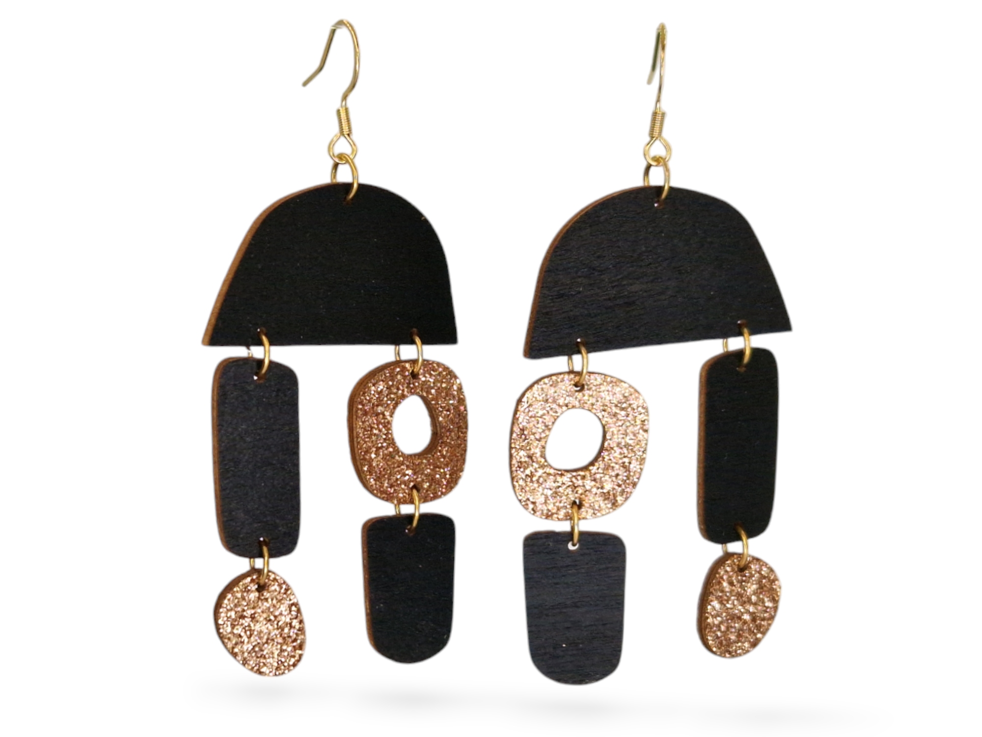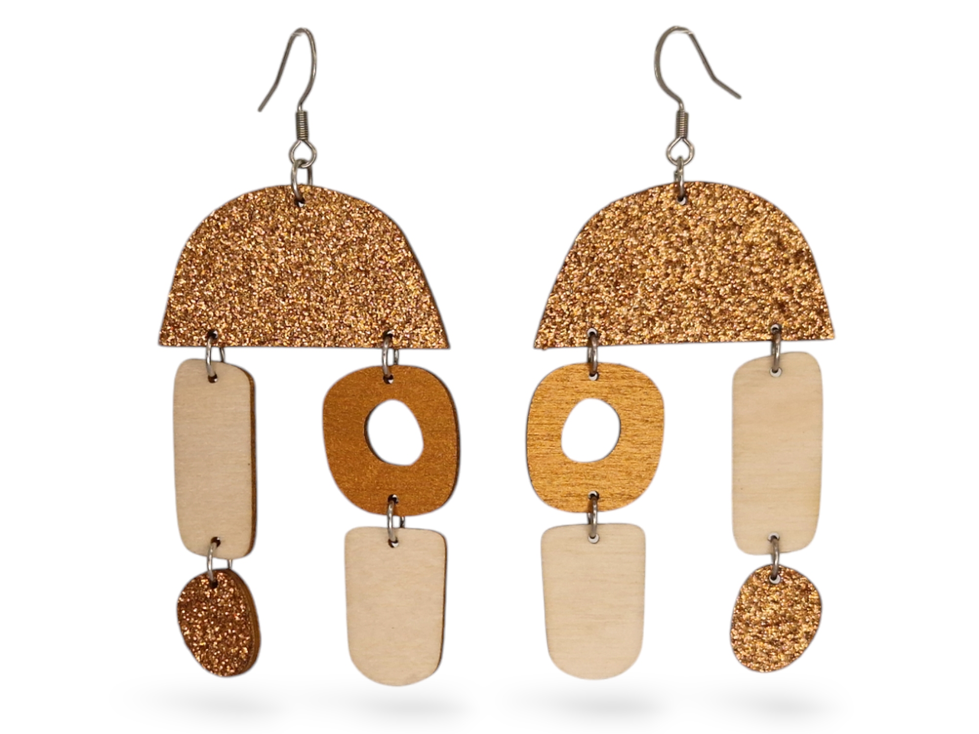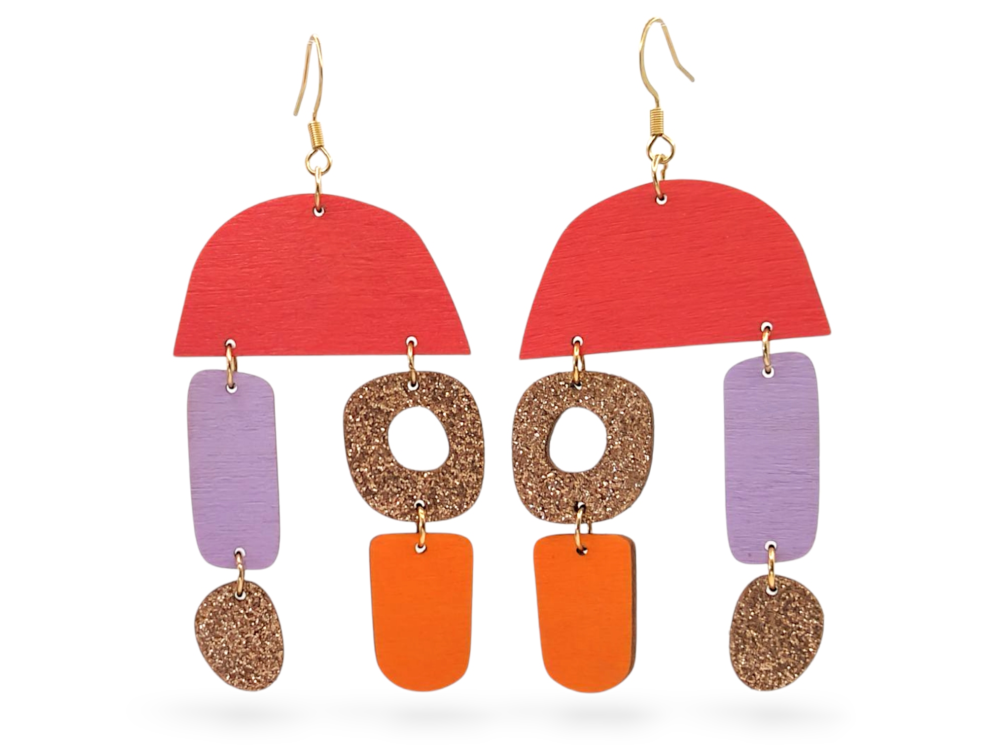 Roikkuvat Uniikki-korvakorut. Geometriset näyttävät puukorvakorut.